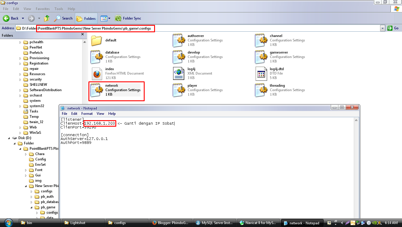 selanjutnya buka folder PointBlankPTS PbindoGems\New Server PbindoGems\pb_game\configs buka network dengan notepand ganti ip yang saya lingkar dengan ip sobat dan save.